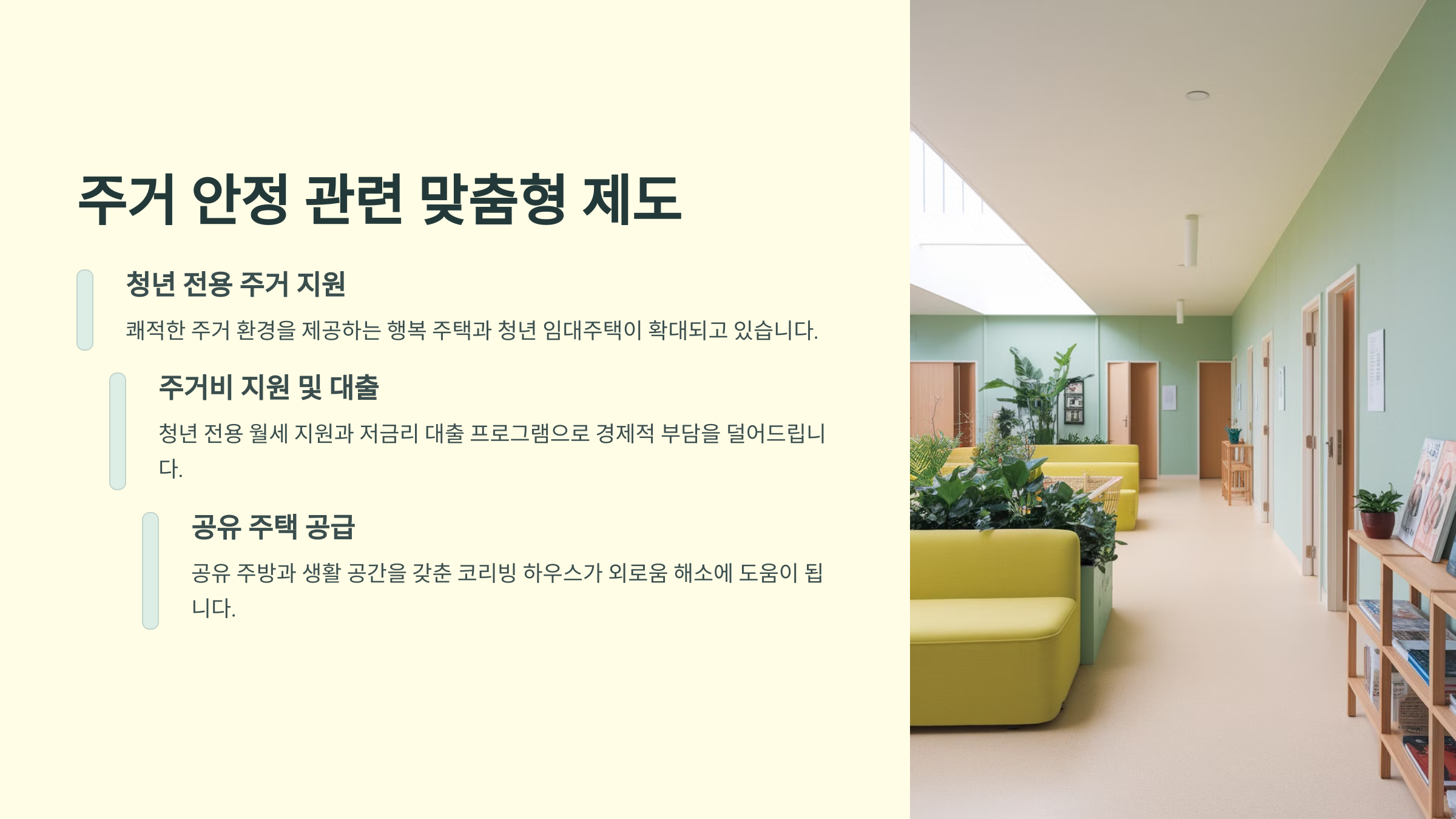 부산 해운대구는 1인 가구 청년을 위해 '공유주방형 셰어하우스'를 조성했어요. 청년들이 함께 거주하면서도, 독립된 공간을 보장받을 수 있는 구조로 큰 인기를 끌고 있죠.