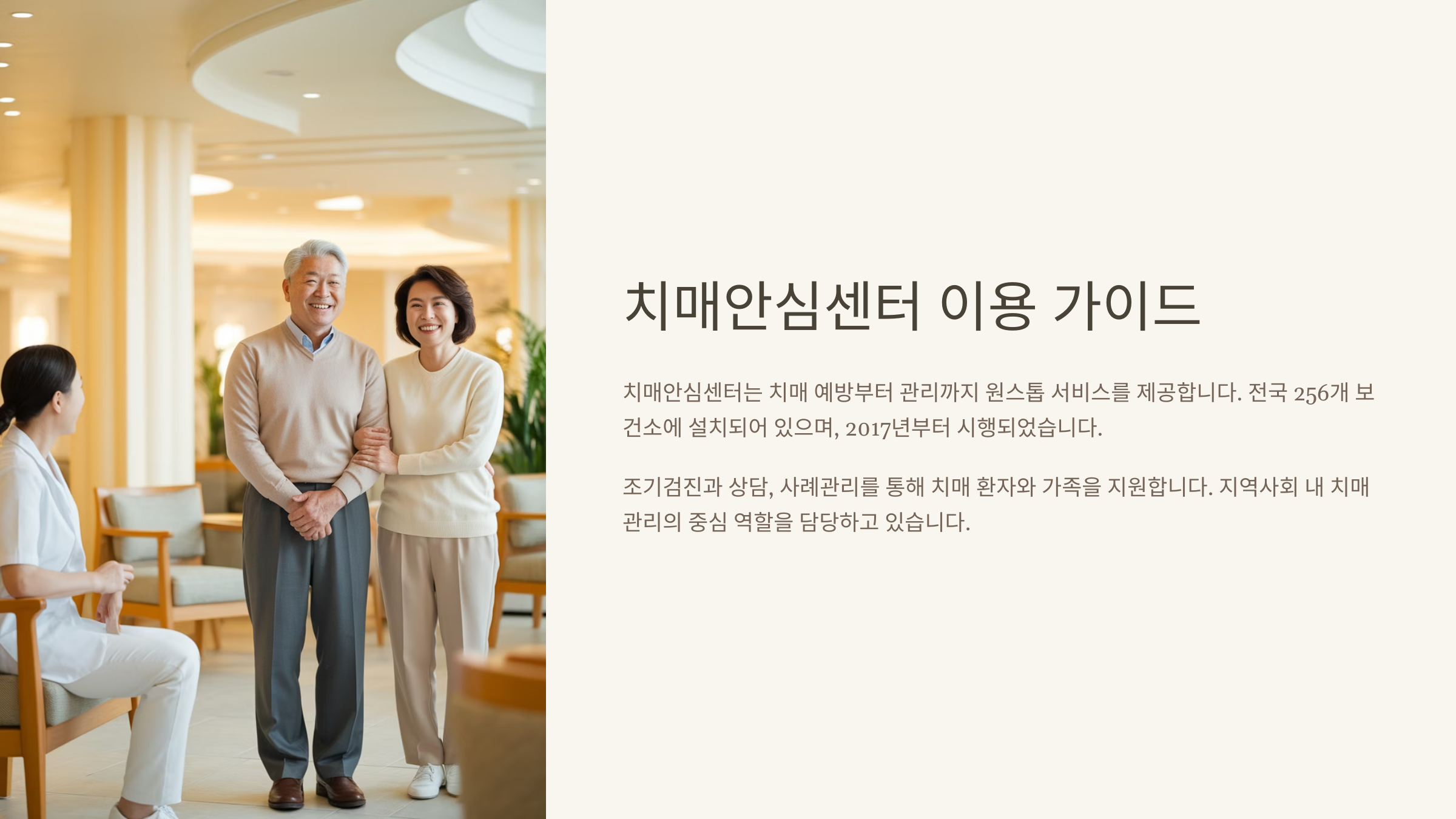 특히 고령화 사회에서 치매는 예방과 조기 관리가 중요한데요, 치매안심센터는 이런 역할을 지역사회에서 담당하고 있어요. 만 60세 이상이면 누구나 무료로 검사를 받을 수 있어요!