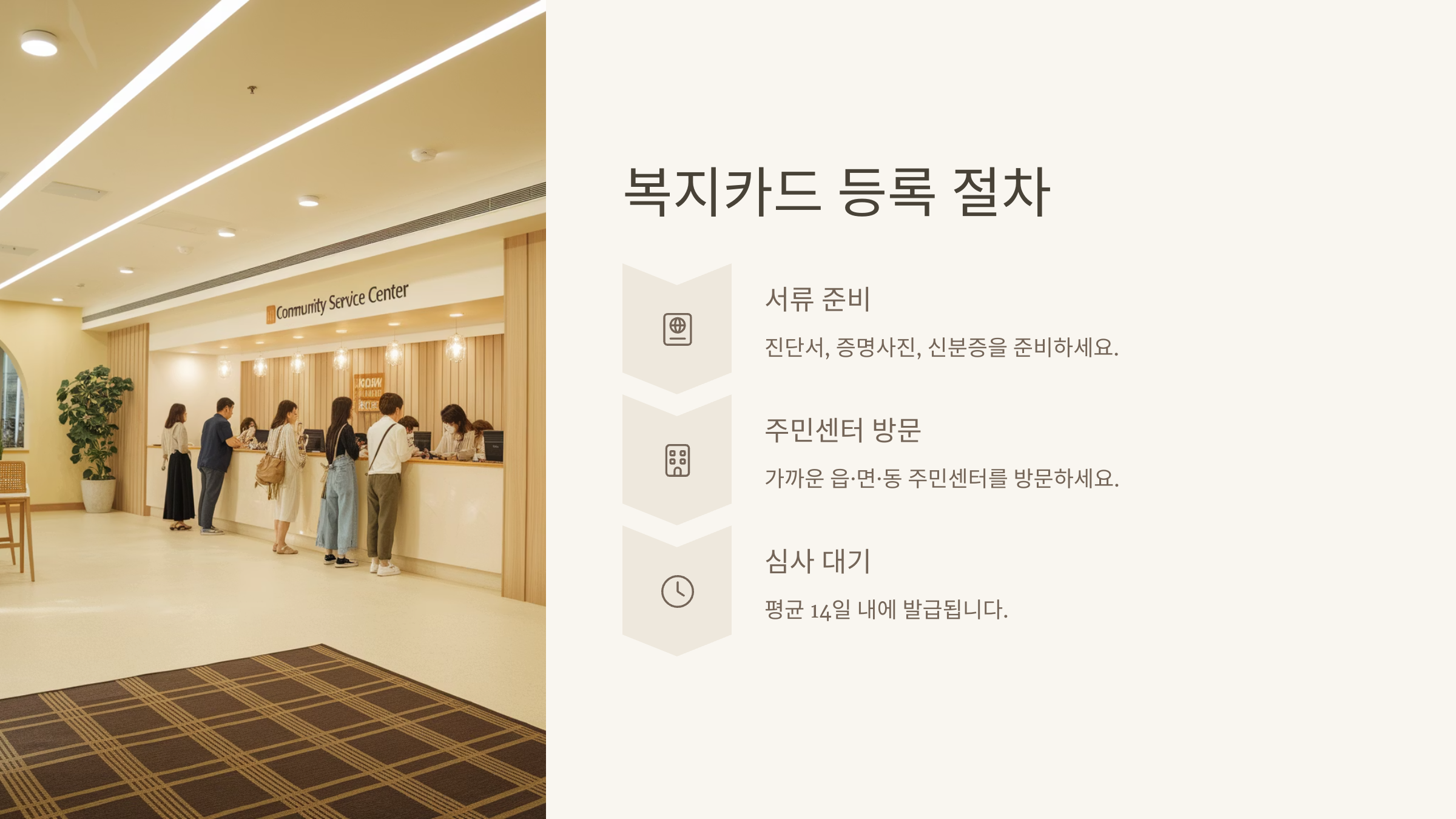 먼저 카드와 본인 신분증을 지참한 후 주민센터를 방문하면 돼요. 담당자가 시스템에 복지카드를 등록해주고, 이후 다양한 복지 혜택과 연계가 가능해져요. 일부 은행에서는 체크카드 기능까지 연동해주기도 해요.