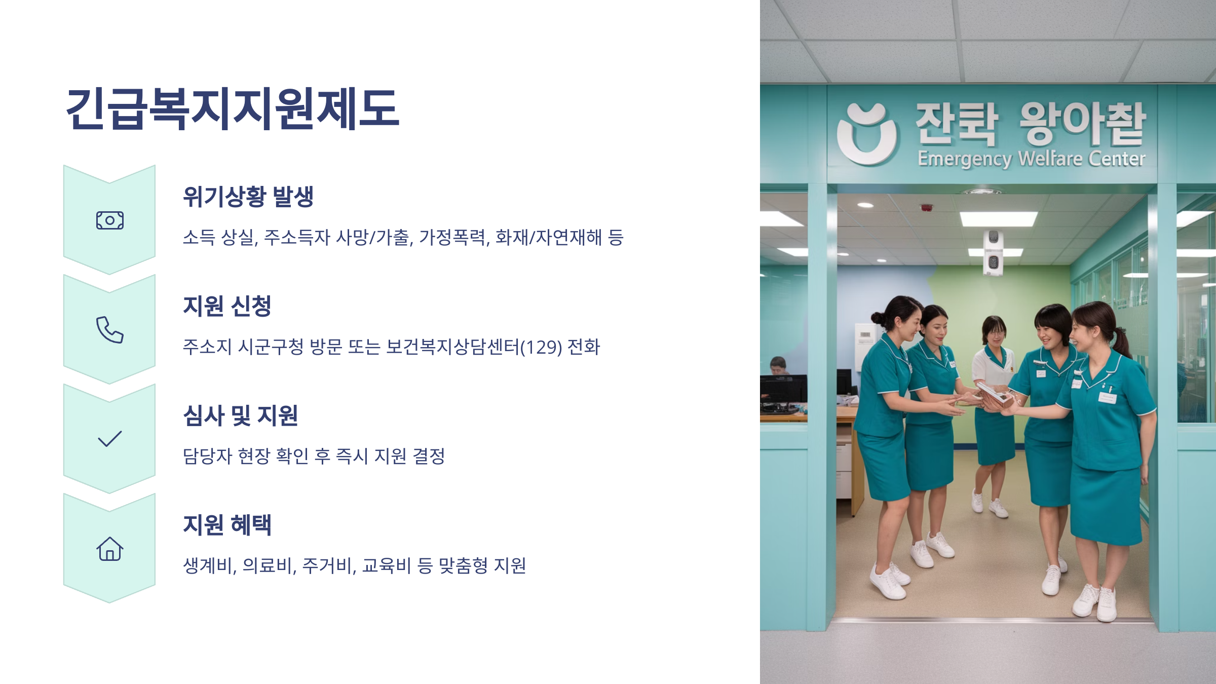 갑자기 일자리를 잃었거나, 사고·질병 등으로 생계유지가 어려운 상황이 생겼을 때는 **긴급복지지원제도**를 이용할 수 있어요. 이 제도는 '갑작스러운 위기상황'이 발생했을 때 단기적으로 생계비, 의료비, 주거비 등을 지원해주는 제도예요.