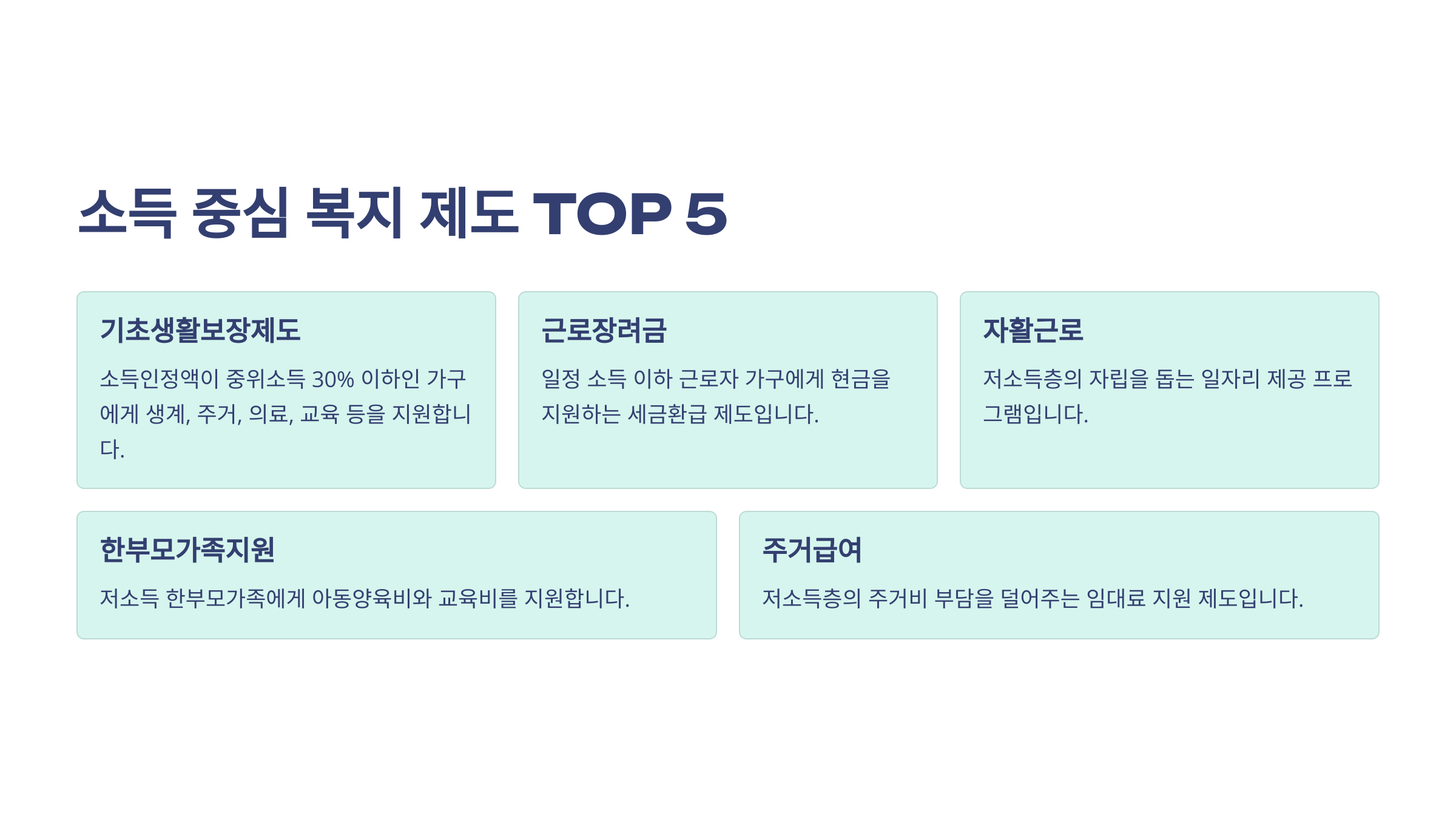 예를 들어 **기초생활보장제도, 긴급복지지원제도, 공공임대주택, 국민취업지원제도** 등은 신용과 무관하게 소득과 재산 기준으로만 판단돼요.