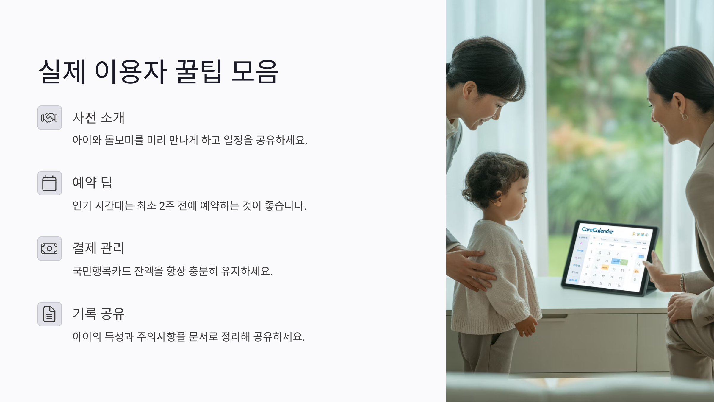 세 번째는 ‘유연한 일정 조정’이에요. 아이돌보미도 일정이 있으니 급작스러운 변경보다는 가능한 일정은 미리 협의하는 것이 좋아요. 특히 연휴나 방학 기간에는 미리 예약하지 않으면 원하는 시간에 배정받기 어려우니 최소 1~2주 전에는 예약하는 걸 추천해요.