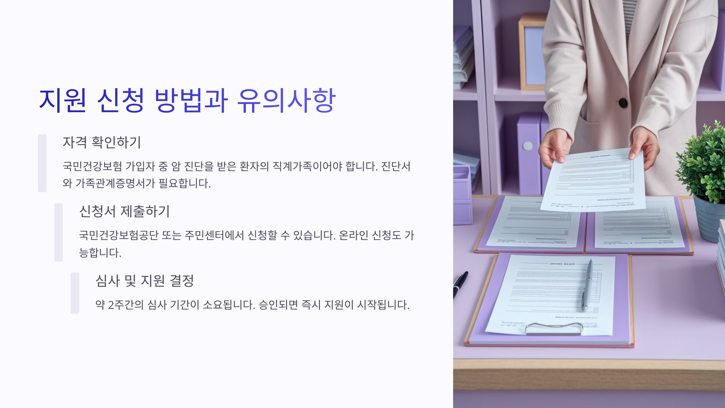 📌 신청은 환자 주소지 주민센터, 국민건강보험공단, 보건소, 고용센터에서 가능해요. 모든 제도는 ‘신청주의’라서 내가 먼저 말하지 않으면 안내도 안 해줘요.