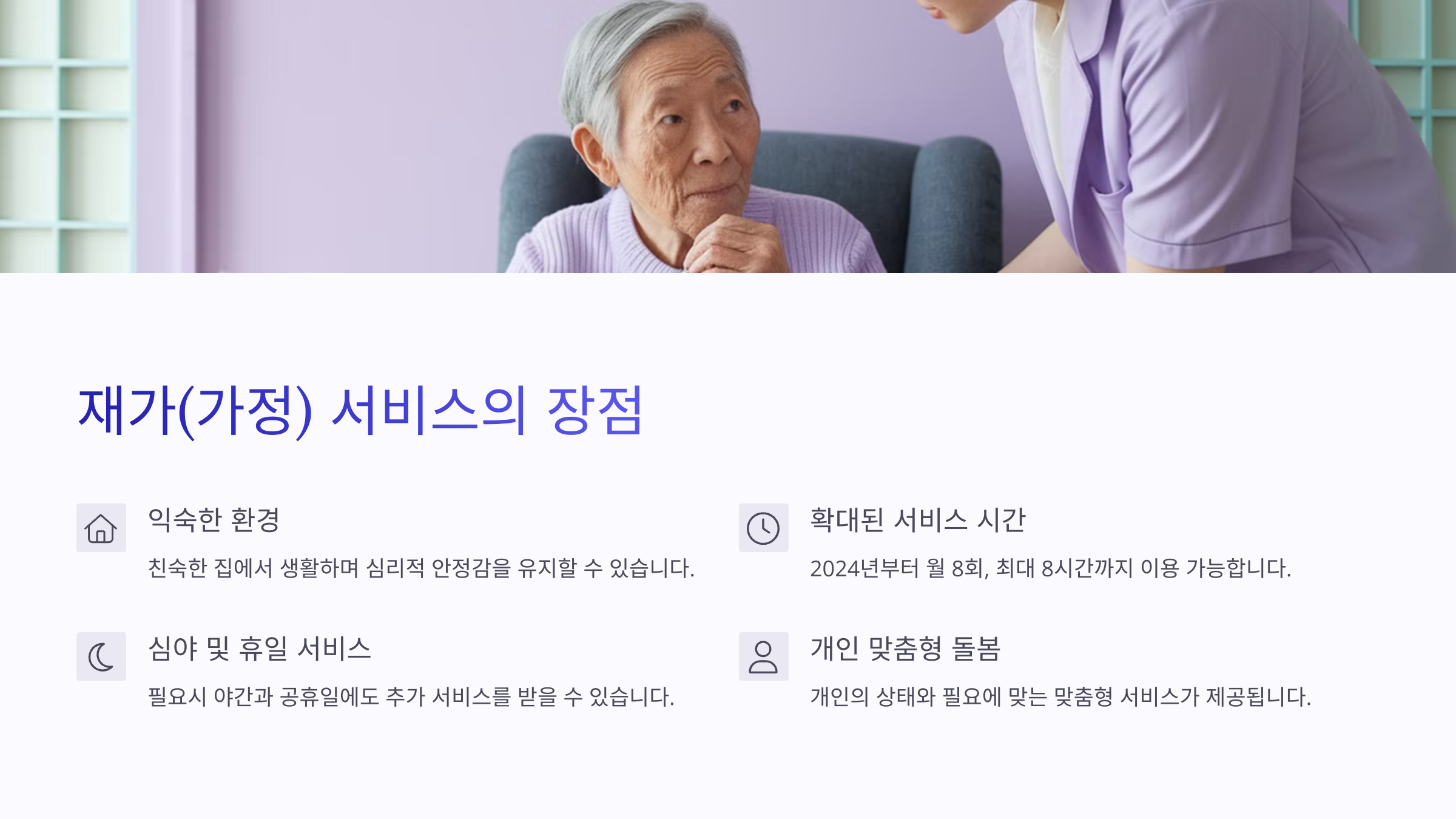 - ✔ 방문요양 – 요양보호사가 집으로 찾아와 케어