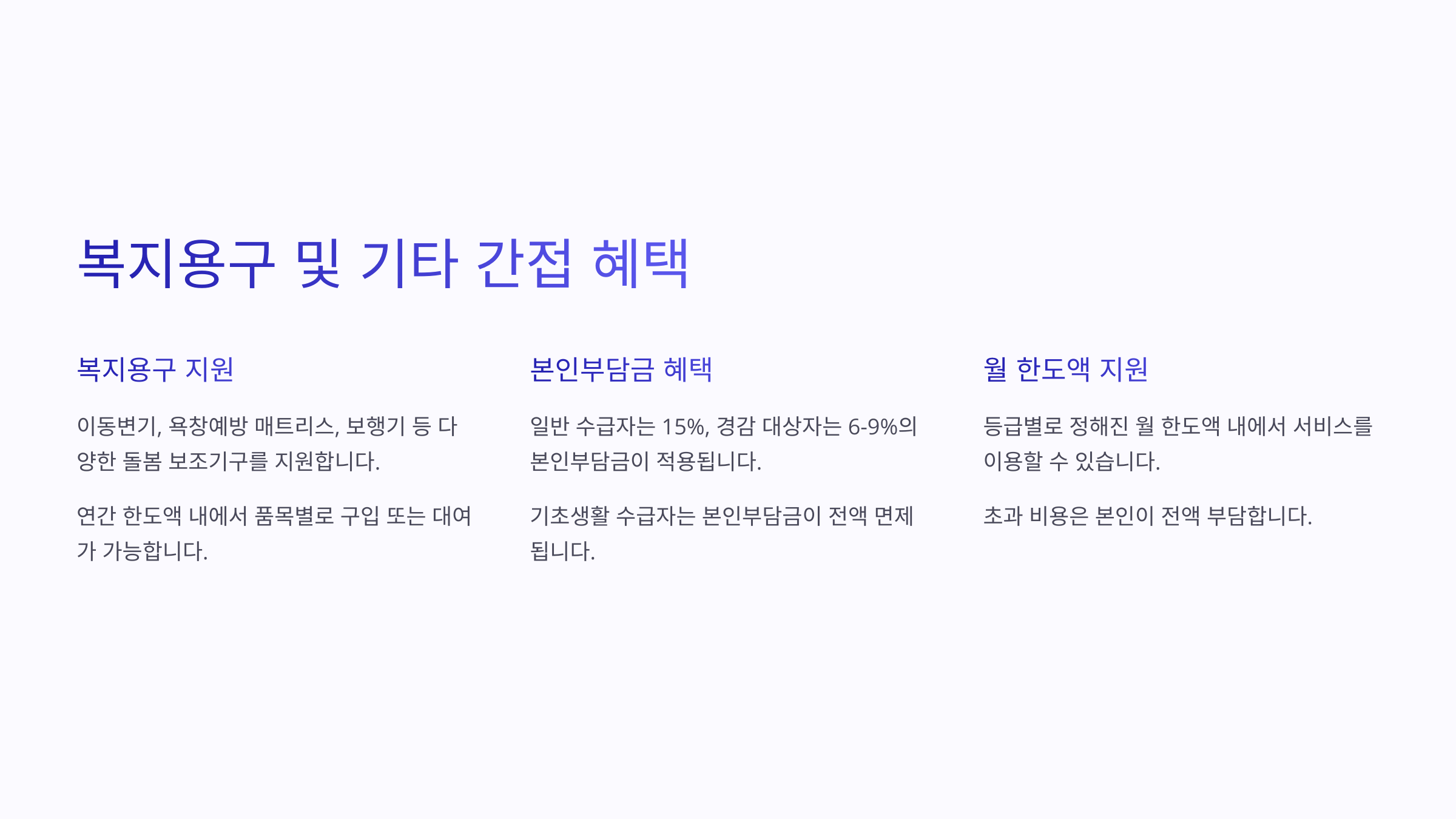 - ✔ 복지용구 지원 – 휠체어, 침대, 안전손잡이 등 제공