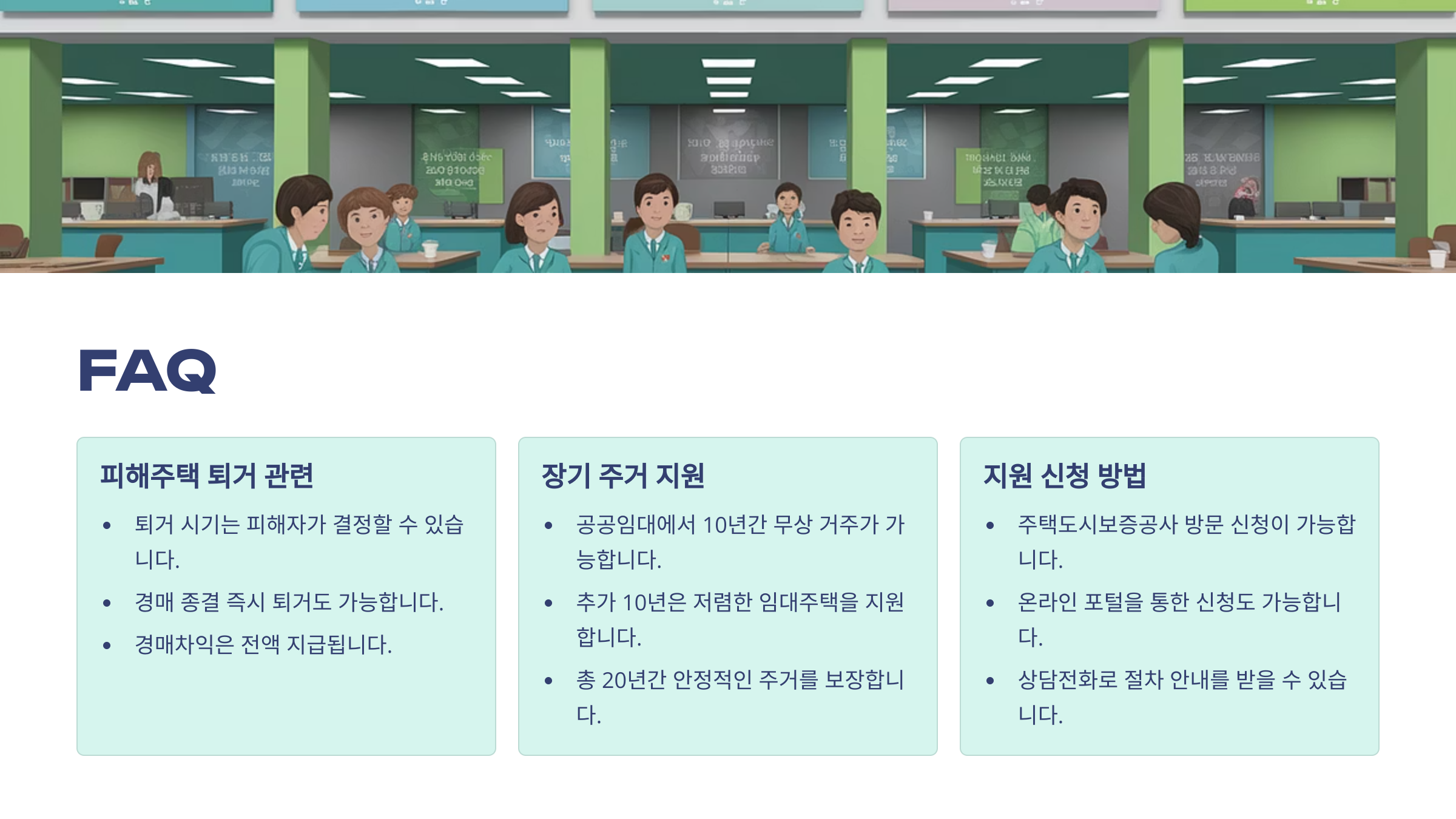 대표적으로는 ▲긴급 임시거처 제공 ▲공공임대 우선 입주권 ▲특례 전세대출 ▲LH 전세금 반환 지원 등이 있어요. 피해 사실만 확인되면 빠르게 연계돼요.