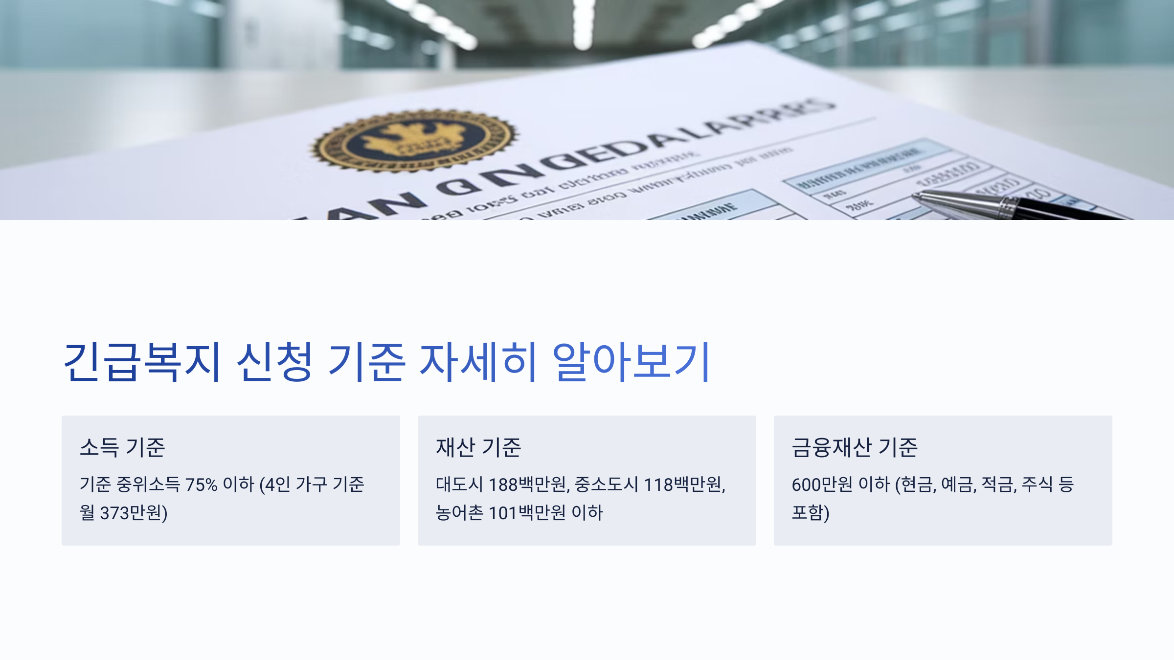 긴급복지지원제도는 일정 기준에 해당하면 단기적으로 생계비, 의료비, 주거비 등을 지원해주는 제도예요. 아래는 2025년 기준 주요 요건이에요: