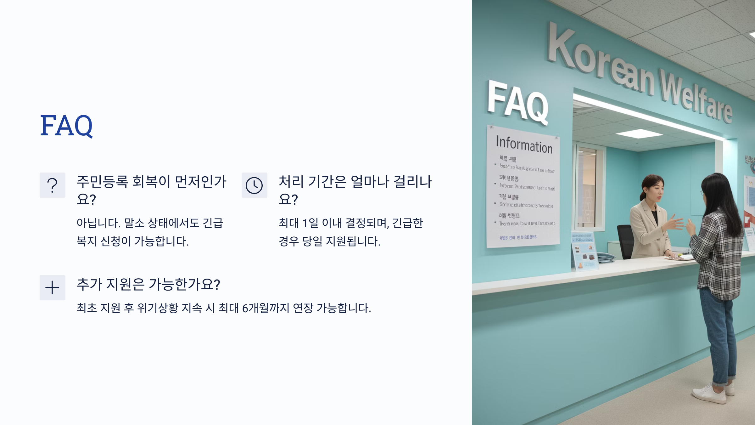주민등록이 말소됐다고 해서 복지 대상이 아닌 건 아니에요. 긴급복지 지원제도는 ‘실질적 위기상황’을 더 중요하게 보거든요. 주소가 없더라도 먹을 것, 입을 곳, 아플 때 치료받을 권리는 누구에게나 보장돼야 해요.