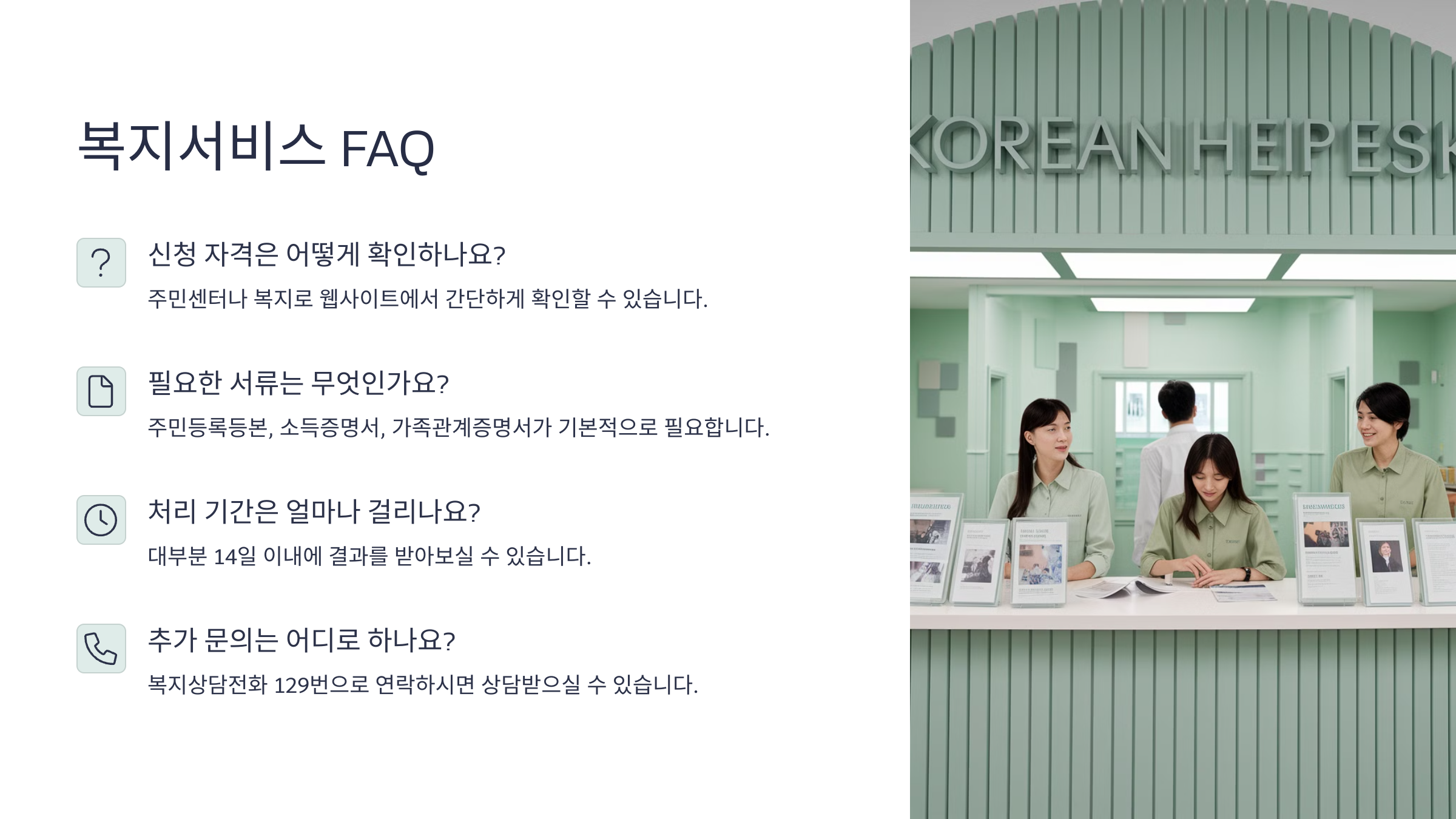 이제 각각의 복지서비스에 대해 좀 더 자세히 살펴볼게요. 신청 조건이나 실제 필요한 서류 팁도 곁들여서 설명해줄게요~ 😊