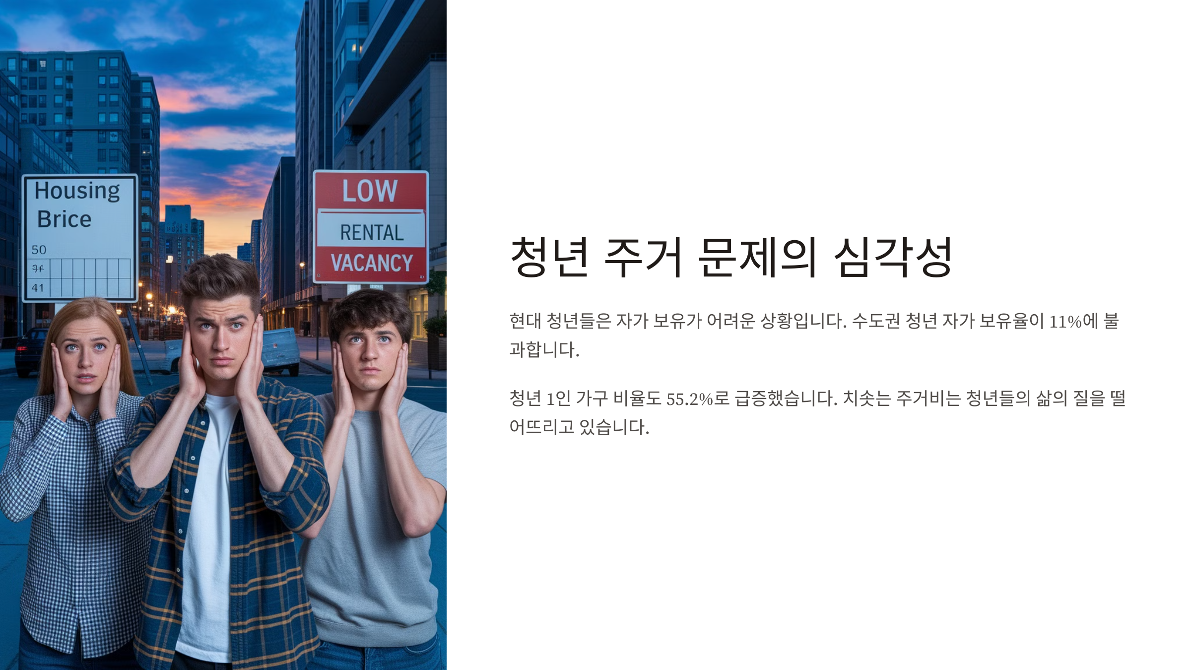 청년의 주거문제는 단순히 월세 비싸서 힘든 게 아니에요. 월세가 비싸면 자산 형성 기회도 줄어들고, 이직이나 구직 선택지도 좁아지며, 사회적 고립까지 이어질 수 있죠.