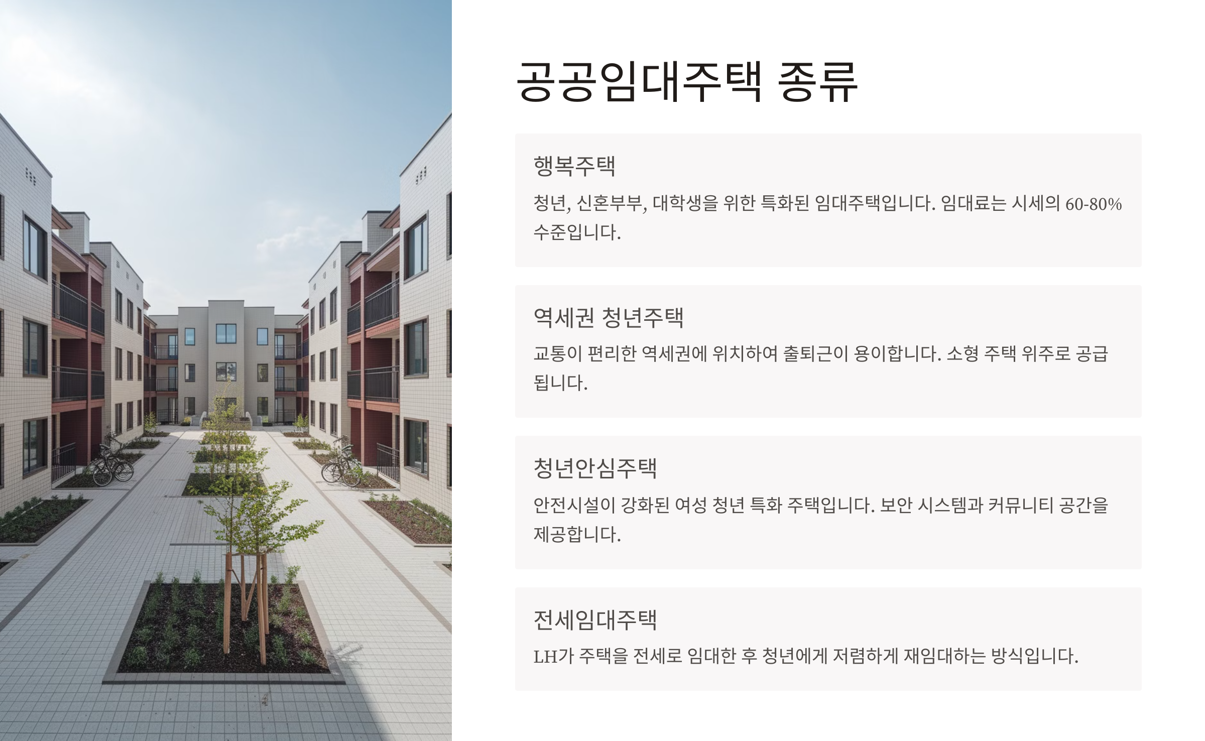 공공임대주택은 소득이 적고, 주거 취약한 청년들에게 저렴한 임대료로 장기간 거주 가능한 주택을 제공하는 제도예요. 종류도 꽤 다양해요.