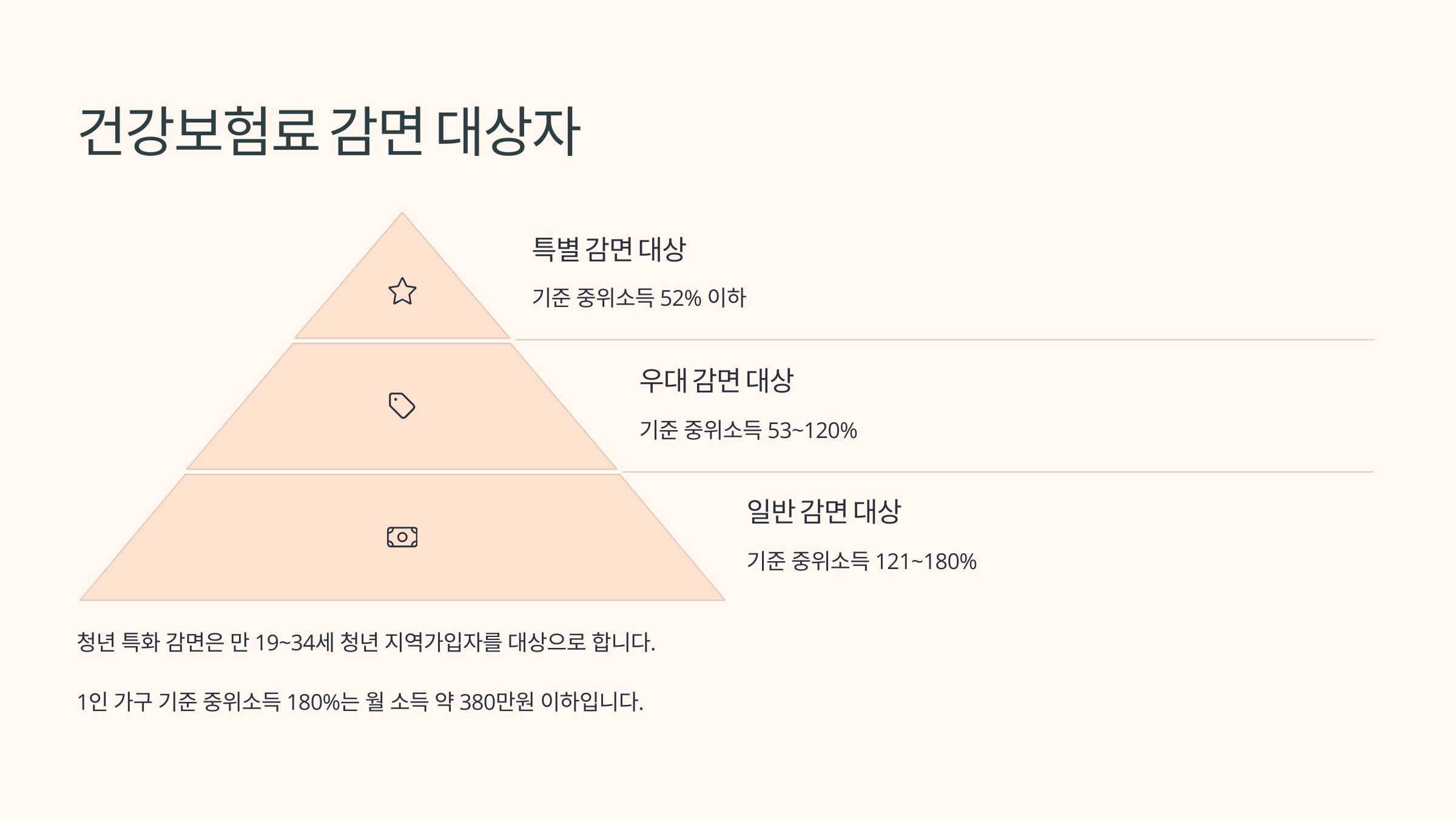 건강보험료 감면 제도는 특정 연령과 소득 조건을 만족하는 청년을 대상으로 적용돼요. 일반적으로는 만 19세에서 34세 사이의 지역가입자 청년 중, 다음과 같은 조건에 해당하면 감면 신청이 가능해요.