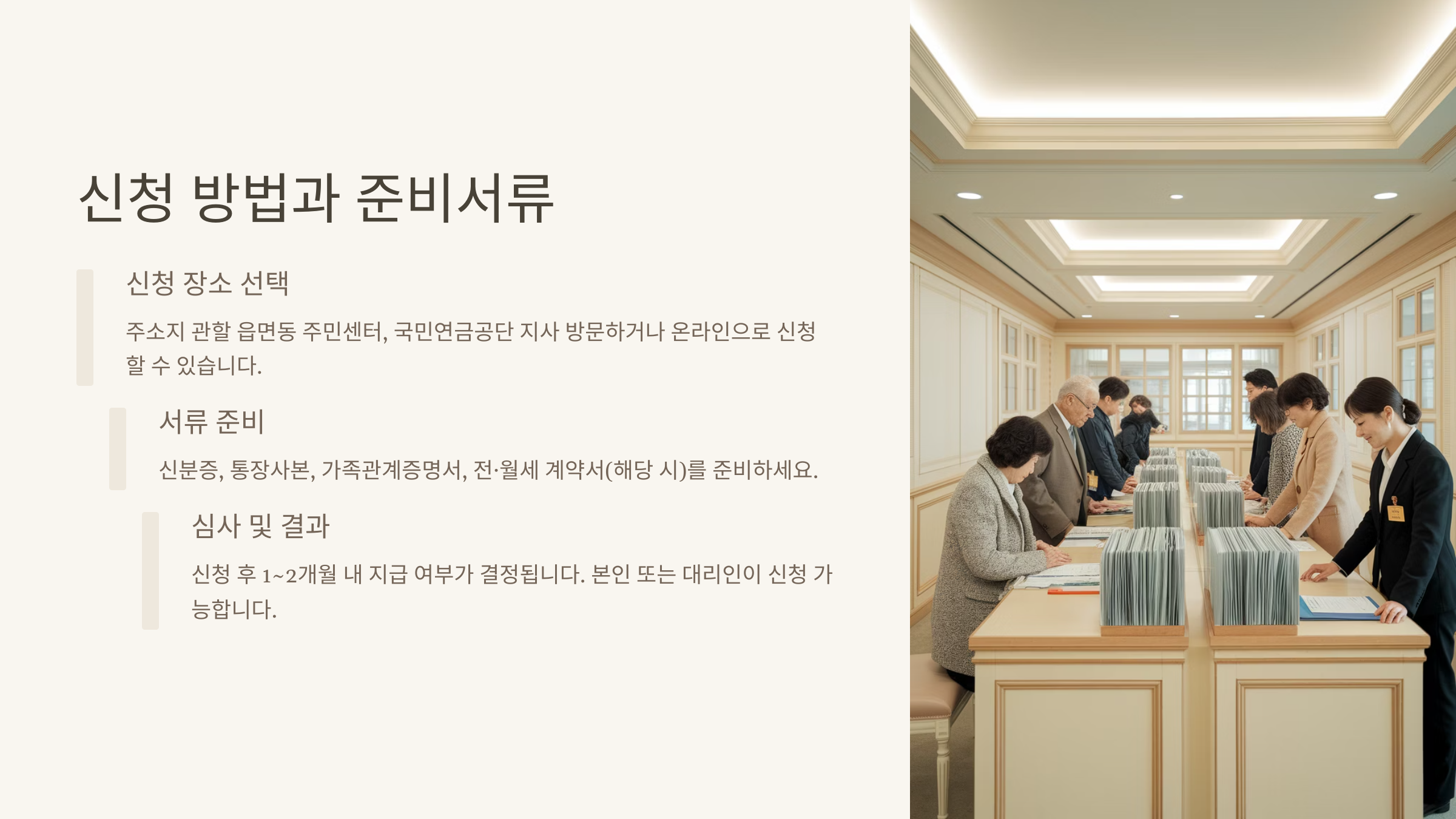 기초연금은 오프라인과 온라인 모두 신청이 가능해요. 주민등록상 주소지의 동 주민센터나 가까운 국민연금공단 지사에 방문하면, 전문 상담사 분들이 신청서를 함께 작성해줘서 쉽게 완료할 수 있어요.