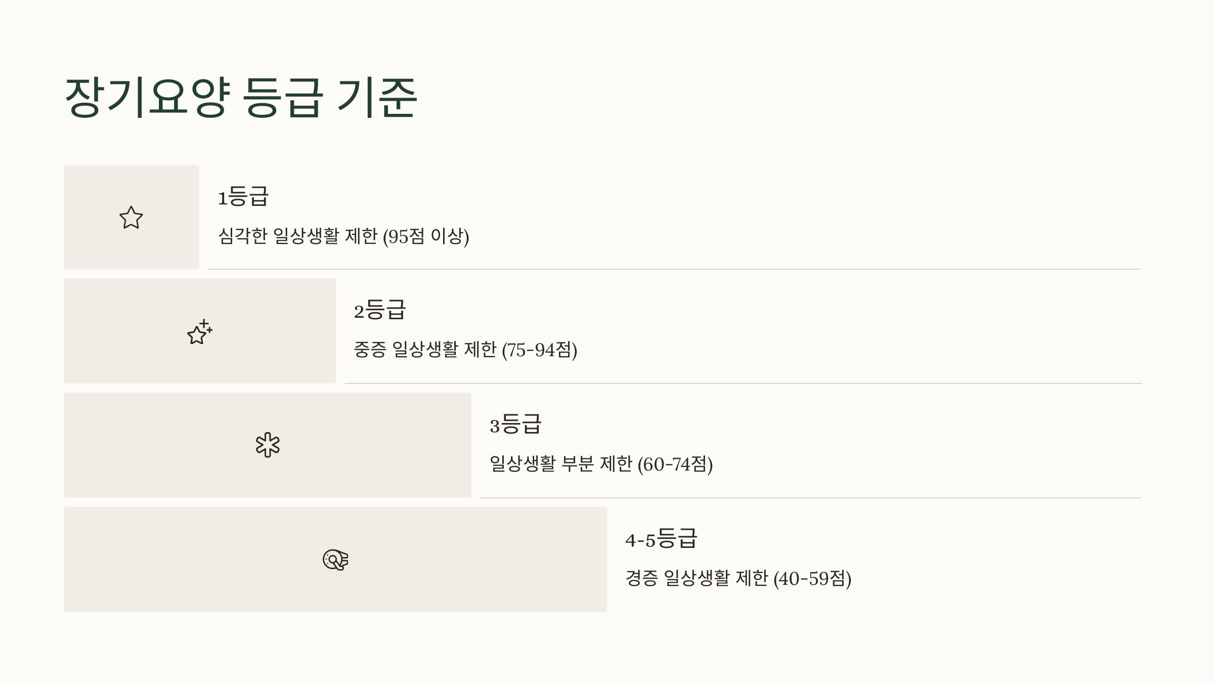 노인장기요양보험에서는 신청자에게 ‘등급’을 부여해서, 필요한 서비스의 양과 강도를 결정해요. 2025년 기준 등급은 1등급부터 5등급, 그리고 인지지원등급까지 총 6개예요.
