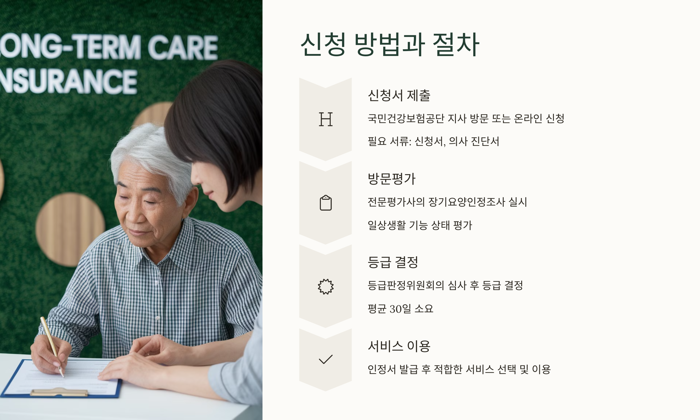 가장 중요한 조건은 “일상생활을 스스로 하기 어려운 상태”인지 여부예요. 이를 위해 요양 인정 신청서를 내면 국민건강보험공단에서 방문조사를 하게 돼요.