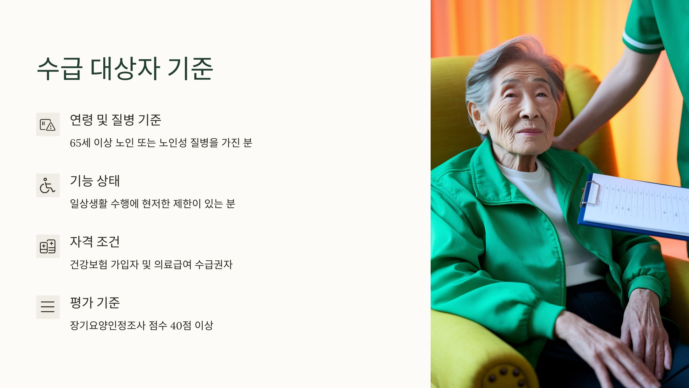 노인장기요양보험은 만 65세 이상 어르신이거나, 65세 미만이라도 치매·파킨슨병·중풍 등 노인성 질환이 있으면 신청할 수 있어요. 단순히 나이만으로 결정되는 건 아니랍니다.