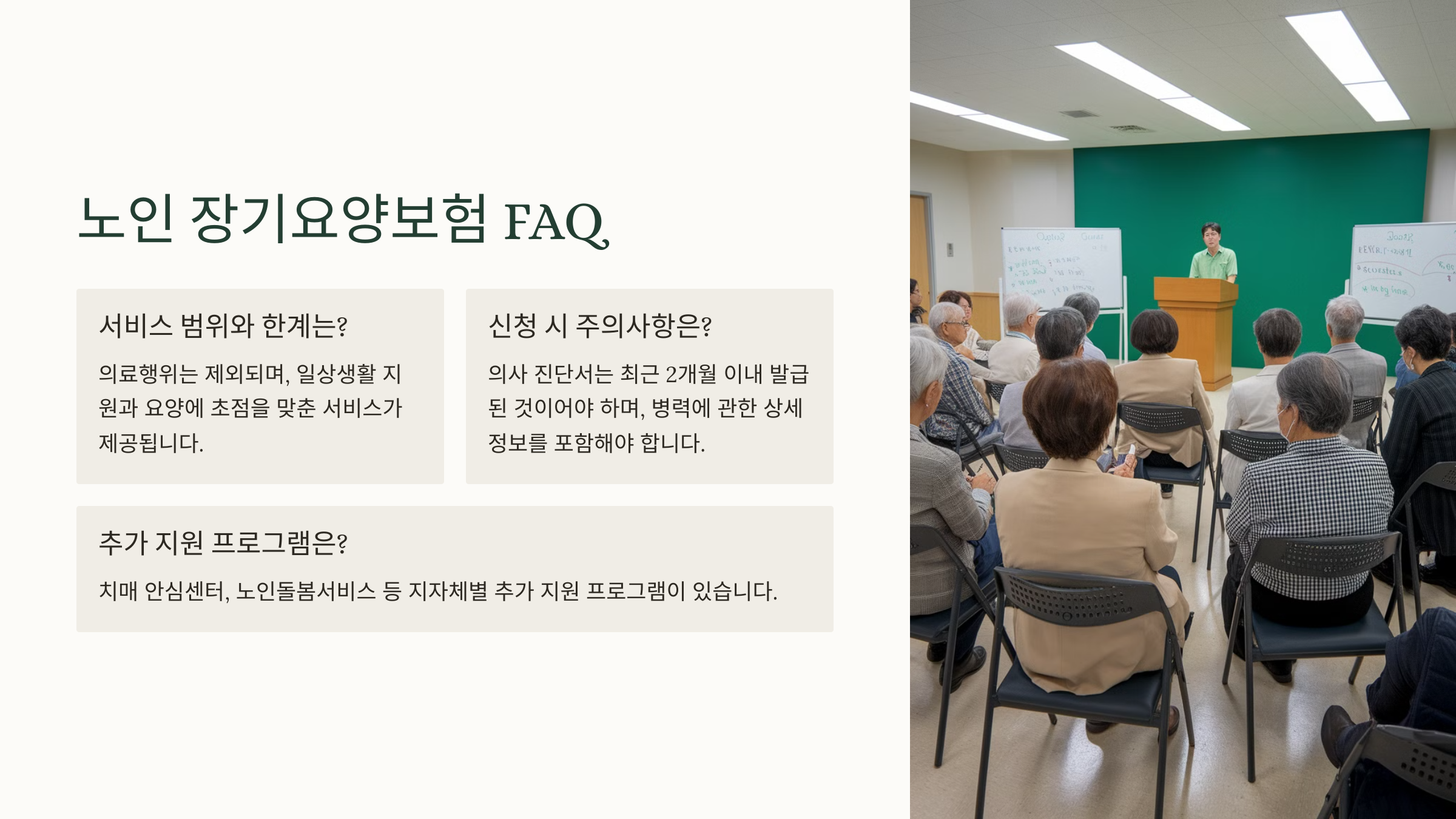 이 제도는 단순한 요양원 입소 지원이 아니라, 집에서도 받을 수 있는 방문 요양, 방문 목욕, 방문 간호 등 다양한 서비스가 포함돼 있어요. 그래서 어르신들이 자기 집에서 오래 머물 수 있도록 도와주는 복지라고도 할 수 있어요 🏡