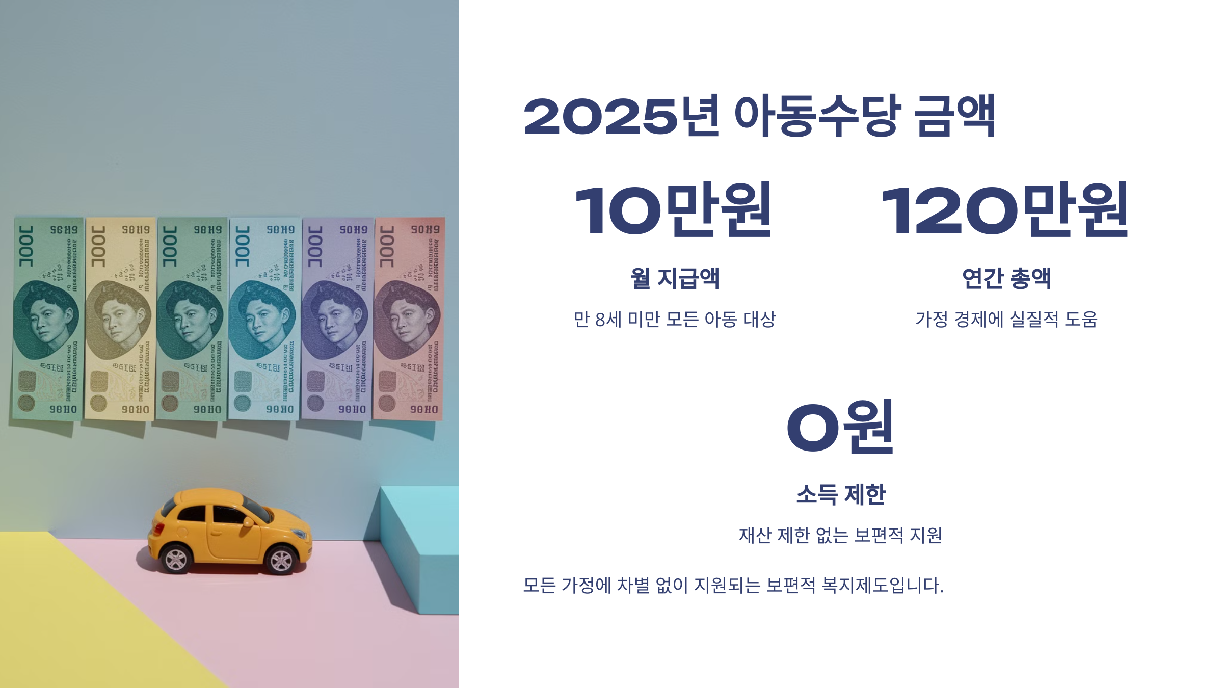 2025년 기준 아동수당은 매월 10만 원 정액 지급돼요. 소득이나 재산 상관없이 모든 아동에게 동일하게 지급된다는 점이 포인트죠!