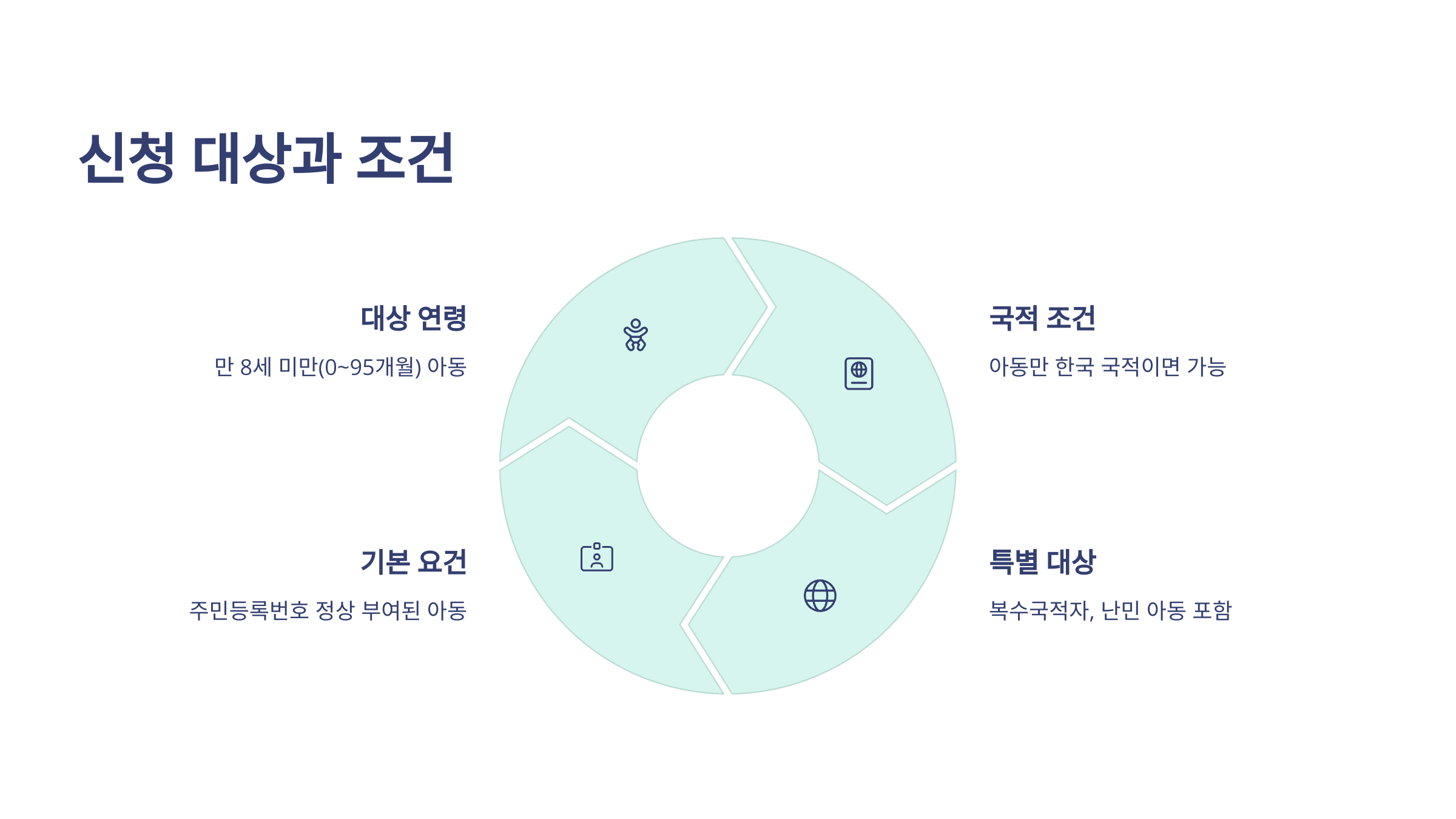 📌 대상 기준은? - 만 8세 미만(생후 0~95개월) 아동 - 대한민국 국적의 아동 - 보호자가 함께 국내 거주 중