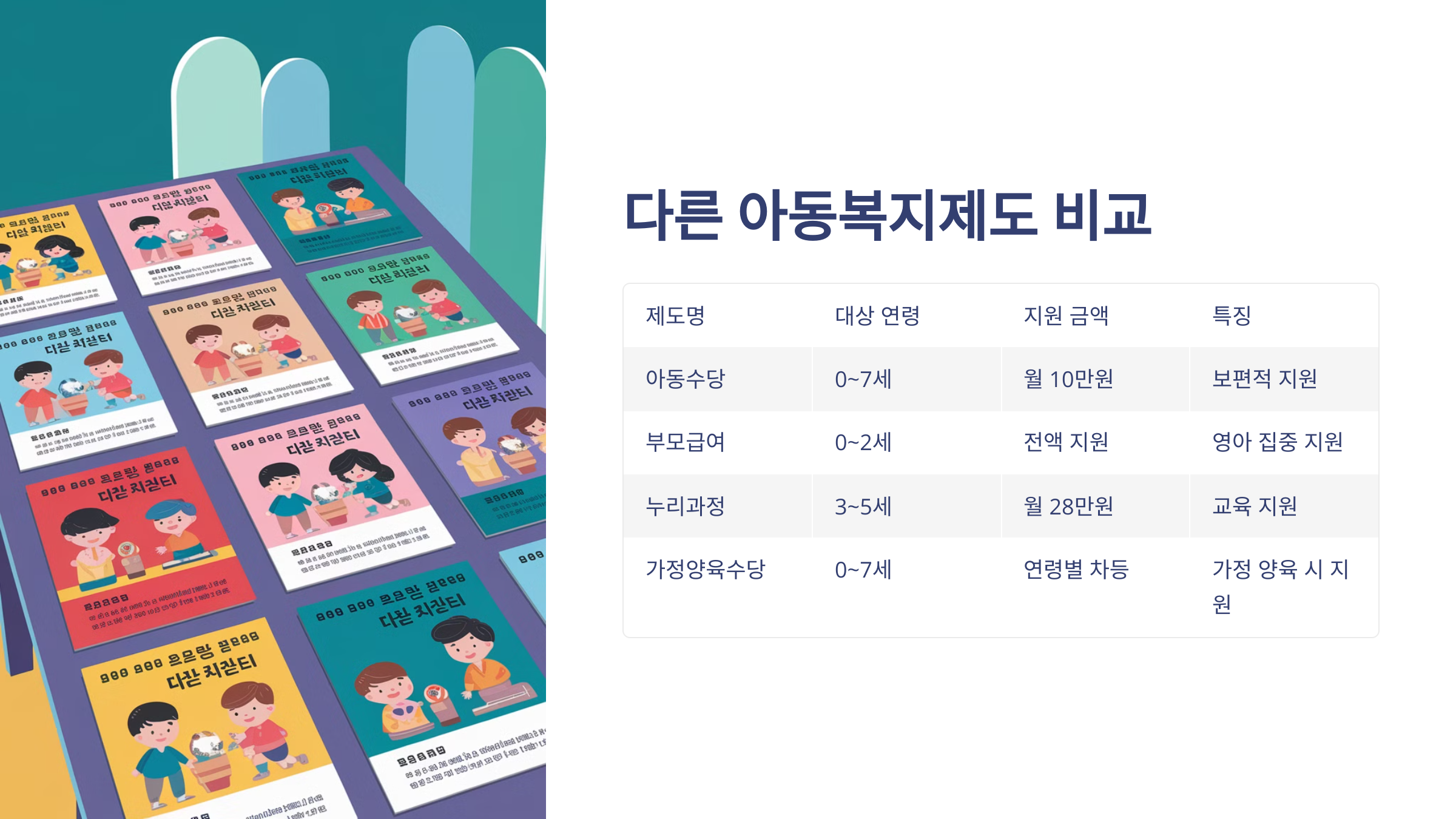 아동수당 외에도 자녀가 있는 가정이라면 꼭 알아야 할 복지제도들이 있어요. 어떤 게 어떤 용도로 쓰이는지 헷갈린다면 아래 표로 쉽게 비교해볼 수 있어요 😊