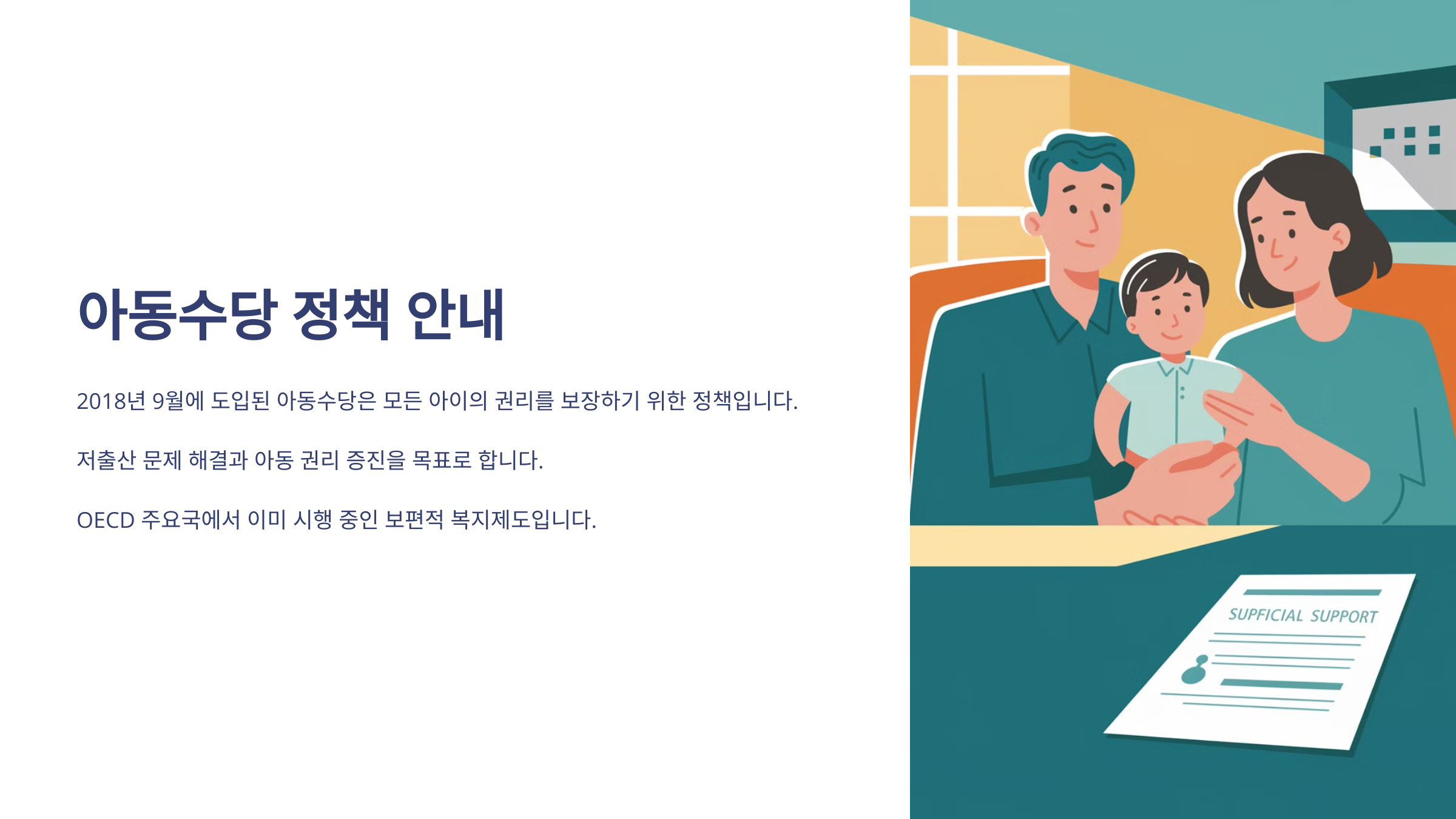 정부는 아동수당을 통해 양육비 부담을 줄이고, 사회 전체의 저출산 문제를 완화하는 데 목표를 두고 있어요. 누구나 아이를 키우는 게 경제적으로 너무 힘들지 않도록, 직접적인 현금 지원을 해주는 거예요.